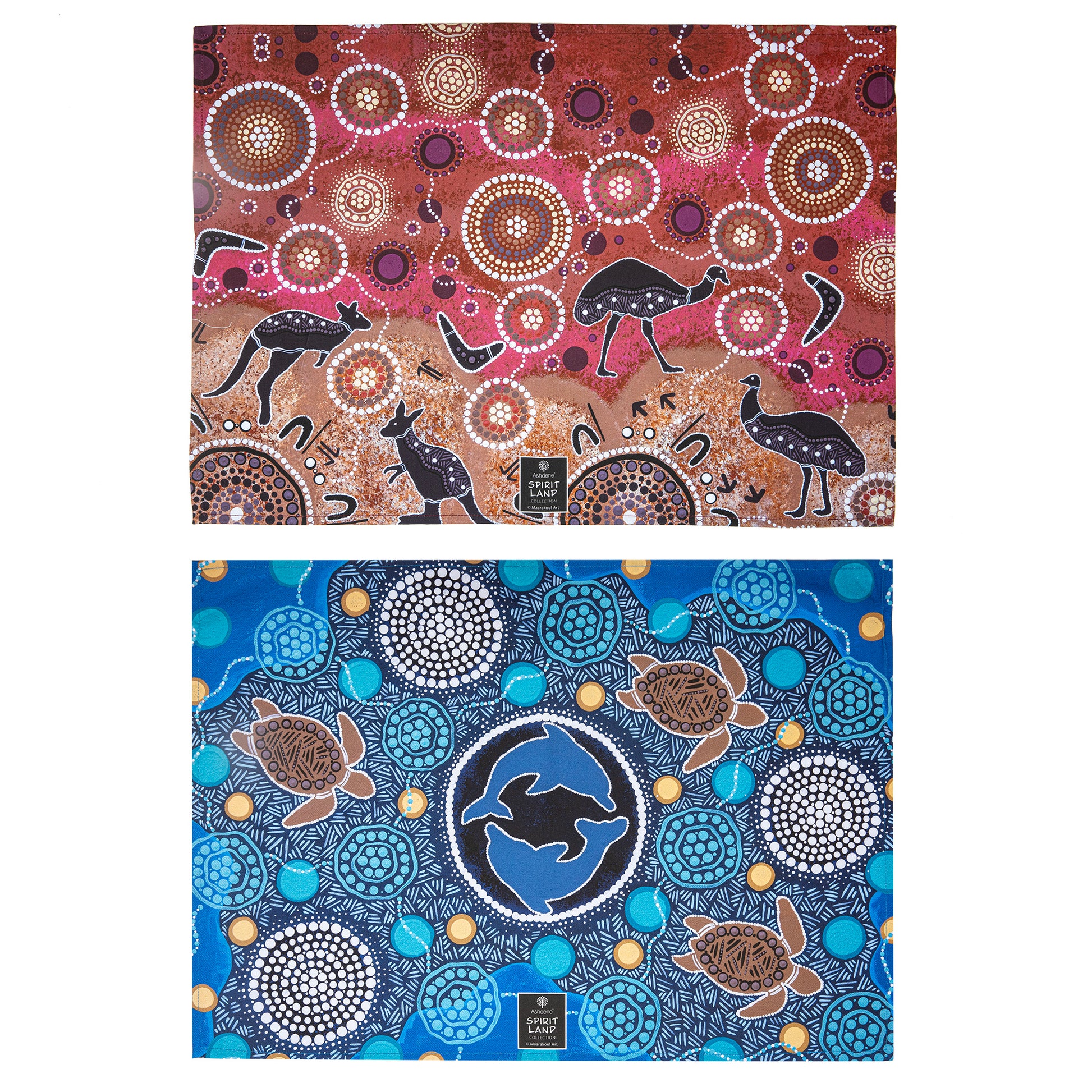 Aboriginal Art Tea Towel Set of 2 – Hunting at Sunset & Harmony in the Waters by Mel Spillman
