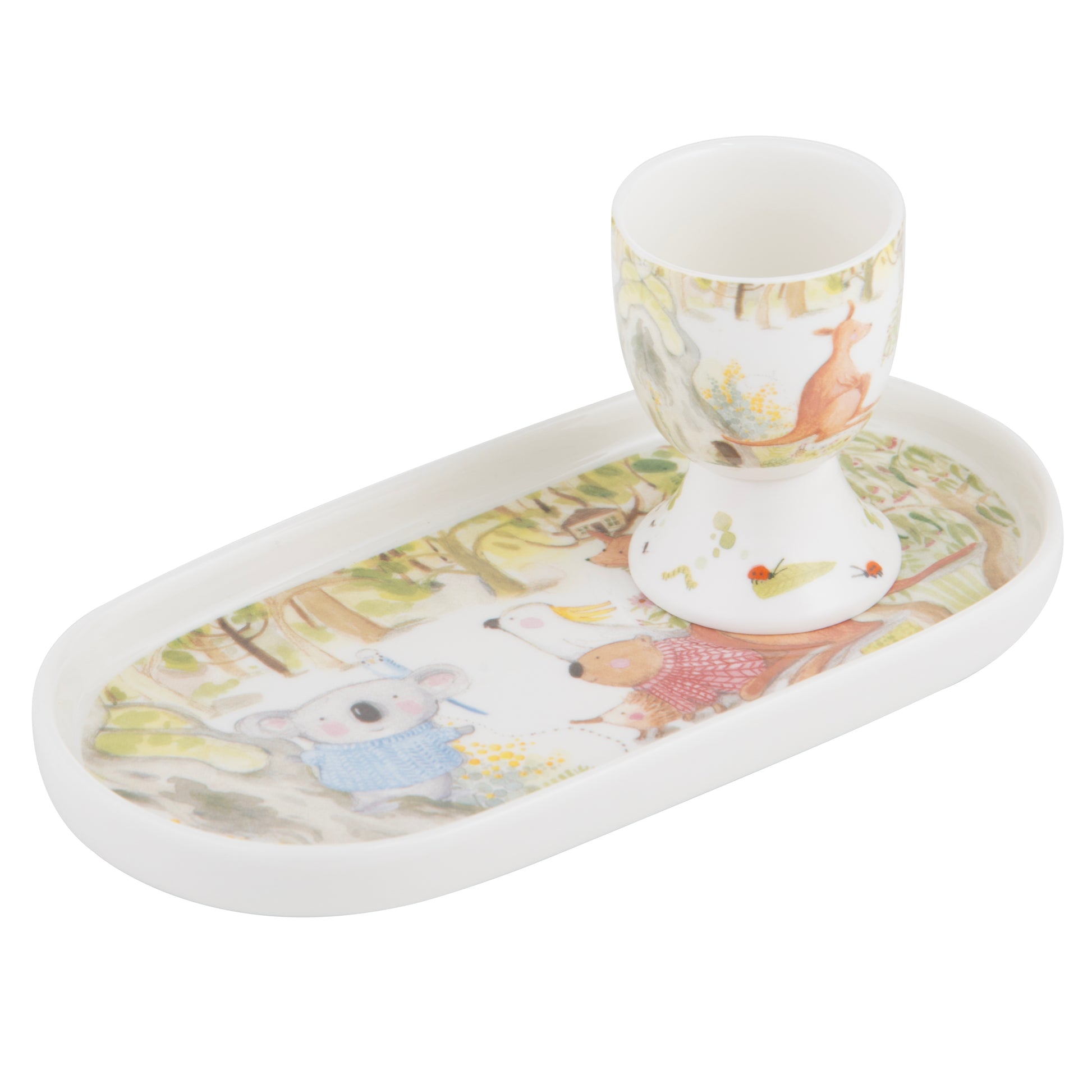 Crafted from New Bone China, this charming set includes a classic egg cup and a matching soldiers tray, perfectly designed for enjoying soft-boiled eggs with toast soldiers. The delightful watercolour illustrations feature beloved Australian animals, bringing a warm and playful touch to the breakfast table.